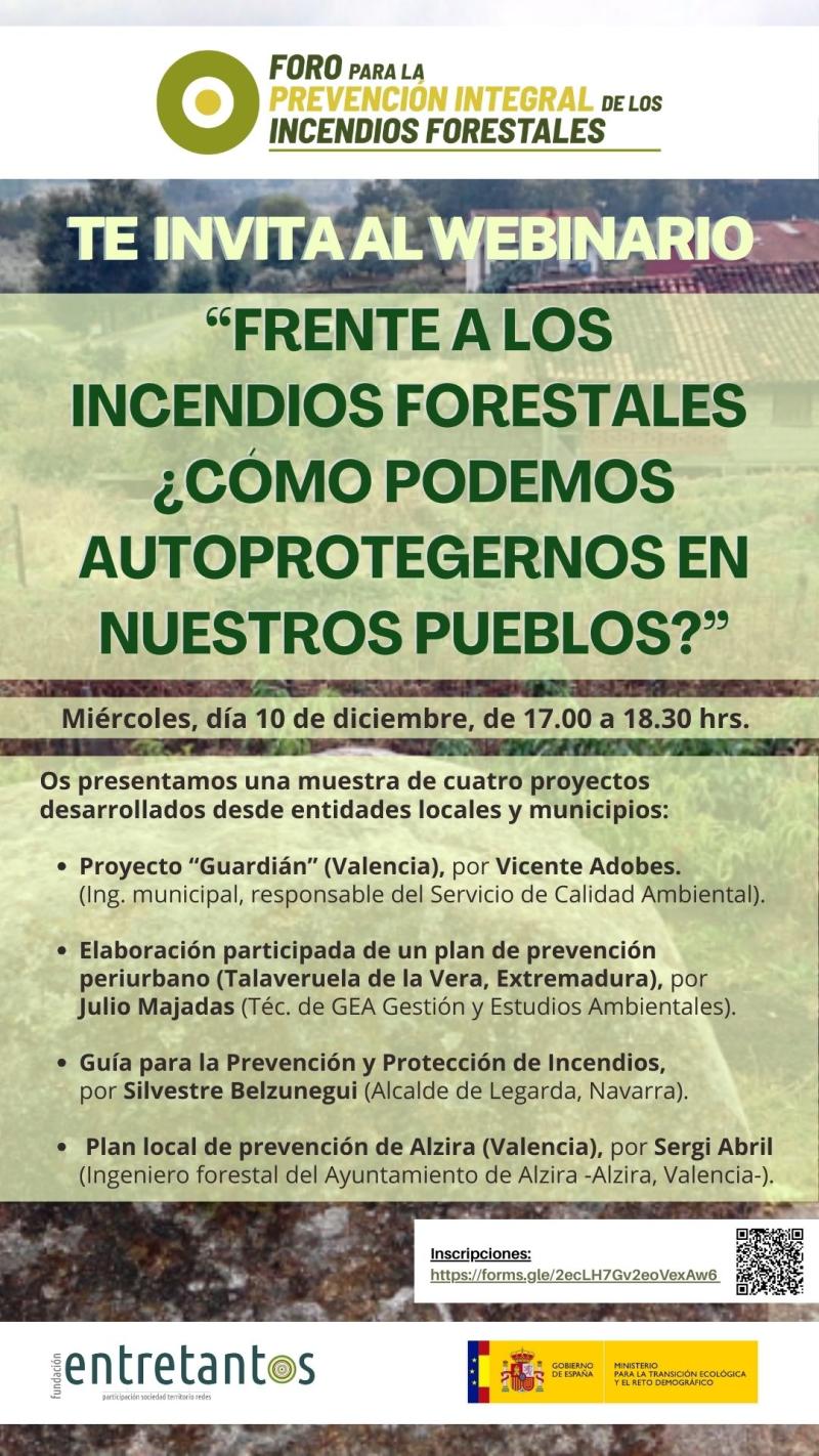 El próximo miércoles, día 10 de diciembre, de 17.00 a 18.30 hrs. el Foro para la Prevención de Incendios Forestales y la Fundación Entretantos, te invitan al webinario «Frente a los Incendios Forestales, ¿cómo podemos autoprotegernos en nuestros pueblos?».
