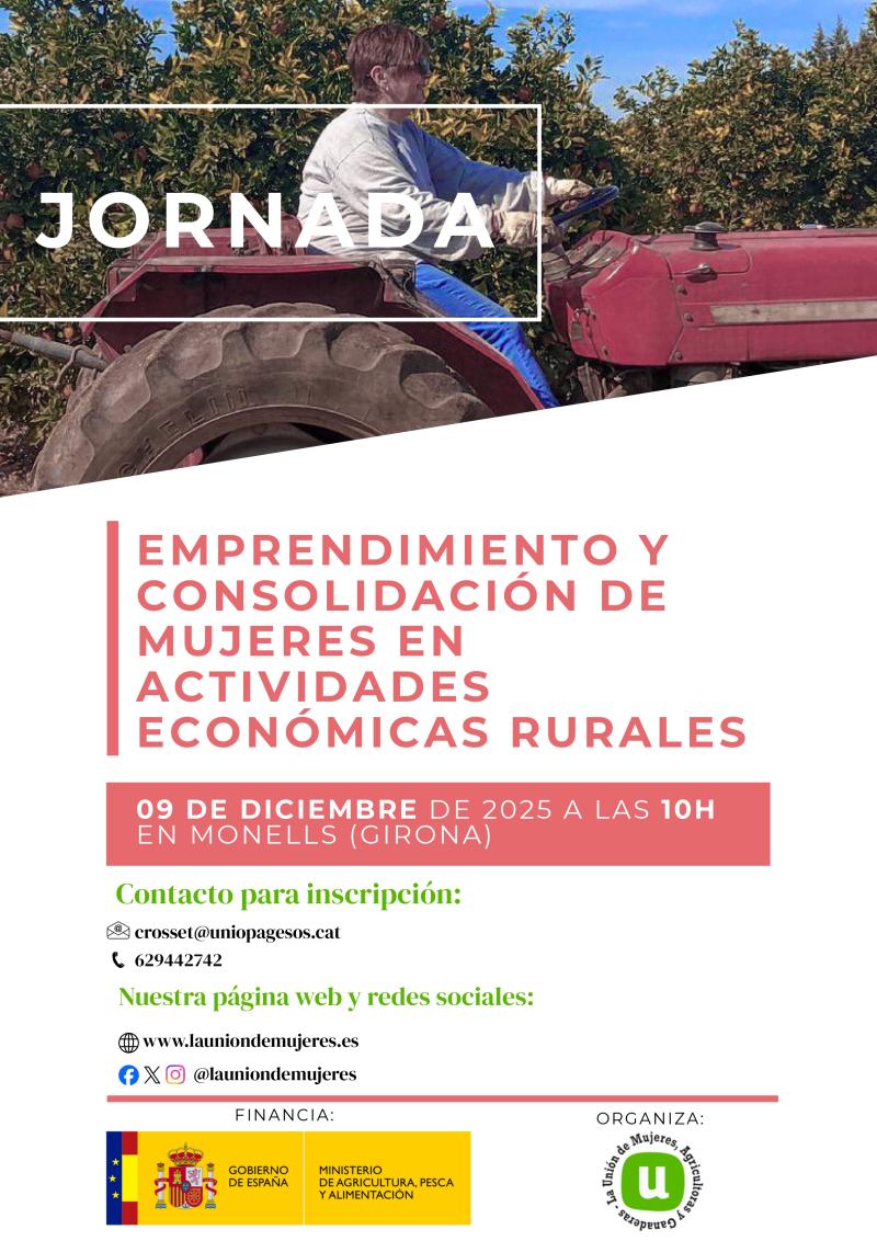 La Unión de Mujeres Agricultoras y Ganaderas organiza una jornada GRATUITA de "EMPRENDIMIENTO Y CONSOLIDACIÓN DE MUJERES EN ACTIVIDADES ECONÓMICAS RURALES", se celebrará el próximo 9 de diciembre de 2025 en horario de 10:00 a 14:15 en el Can Geronès de Monells (Girona), ubicado en Placeta 1 d'octubre.