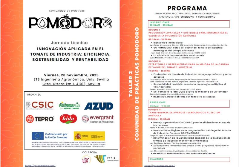 En este marco, te invitamos a participar en la Jornada TécnicaINNOVACIÓN APLICADA EN EL TOMATE DE INDUSTRIA: EFICIENCIA, SOSTENIBILIDAD Y RENTABILIDAD”, que se celebrará de manera presencial el viernes 28 de noviembre de 2025 y que tendrá lugar en la Escuela Técnica Superior de Ingeniería Agronómica de la Universidad de Sevilla (https://maps.app.goo.gl/Yxao1JV68LbMkoSp6).